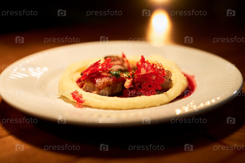 Гурманское блюдо из мяса с пюре картофеля и декоративным красным украшением, подаваемым