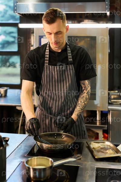 Молодой взрослый мужчина готовит в профессиональной кухне, нося фартук