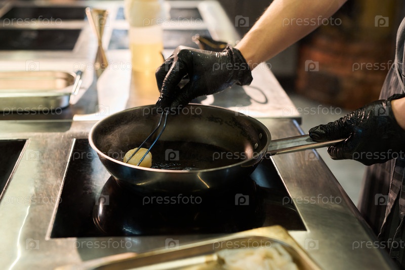 Молодой взрослый мужчина готовит еду в сковородке на профессиональной печи