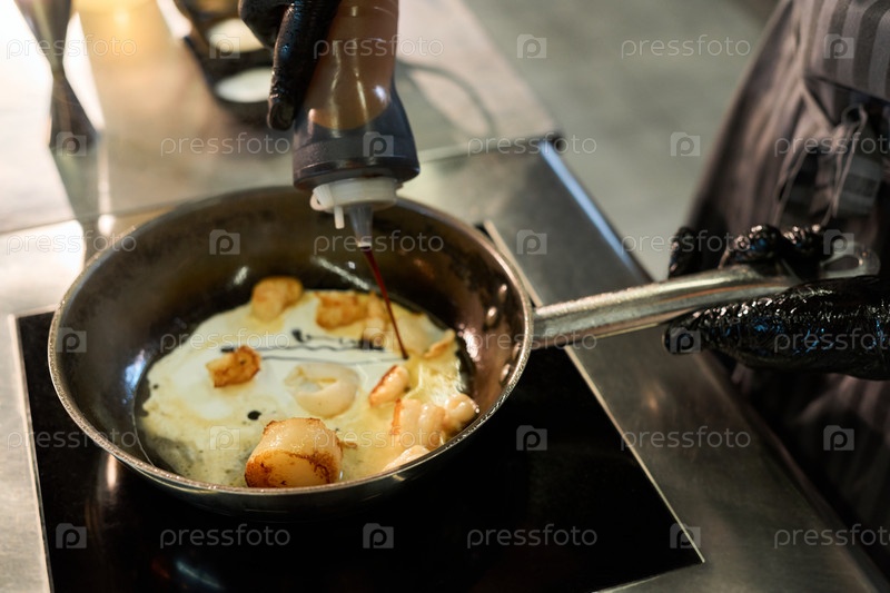 Молодой взрослый мужчина готовит миндалины в сковороде, добавляя соус