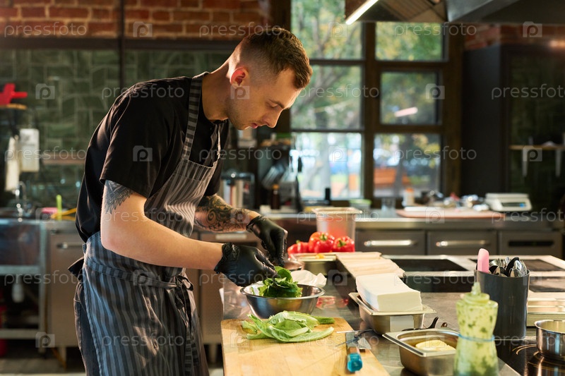 Молодой взрослый мужчина готовит салат на профессиональной кухне ресторана