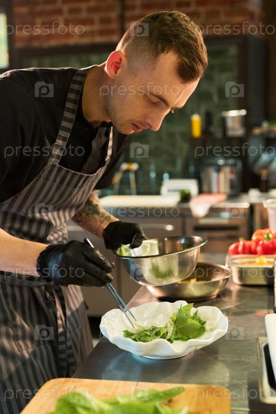 Молодой взрослый мужчина собирает свежий зеленый салат на кухне ресторана