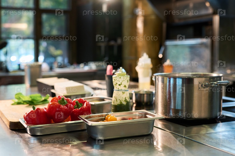Овощи и кулинарные принадлежности для приготовления пищи на профессиональной кухне