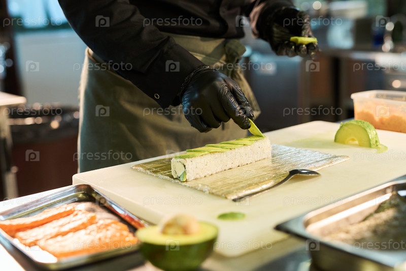 Молодой взрослый мужчина готовит рулон суши с авокадо на профессиональной кухне