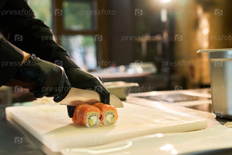 Молодой взрослый мужчина нарезает рулоны суши на режущей доске в кухне ресторана