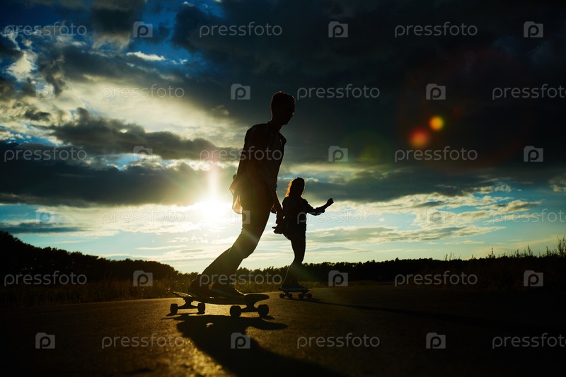 Подросток и девочка-подросток катаются на скейтборде в открытом воздухе во время захода солнца