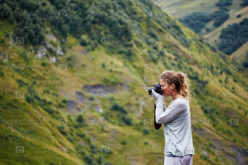 Молодая женщина фотографирует живописный горный пейзаж на открытом воздухе