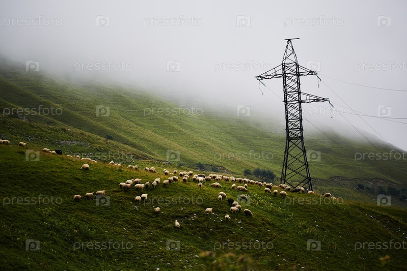 Стадо овец, пасущихся на зеленом склоне холма возле башни электропередачи