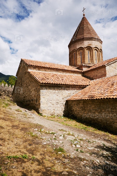 Древняя каменная церковь с башней, стоящая под облачным небом в сельской местности