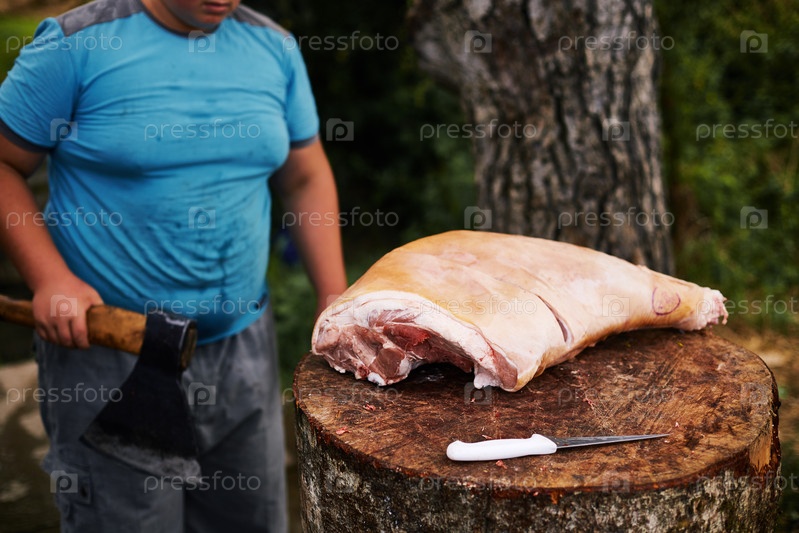 Избыточный вес подросткового мальчика готовит свинину на открытом воздухе с помощью топора и ножа