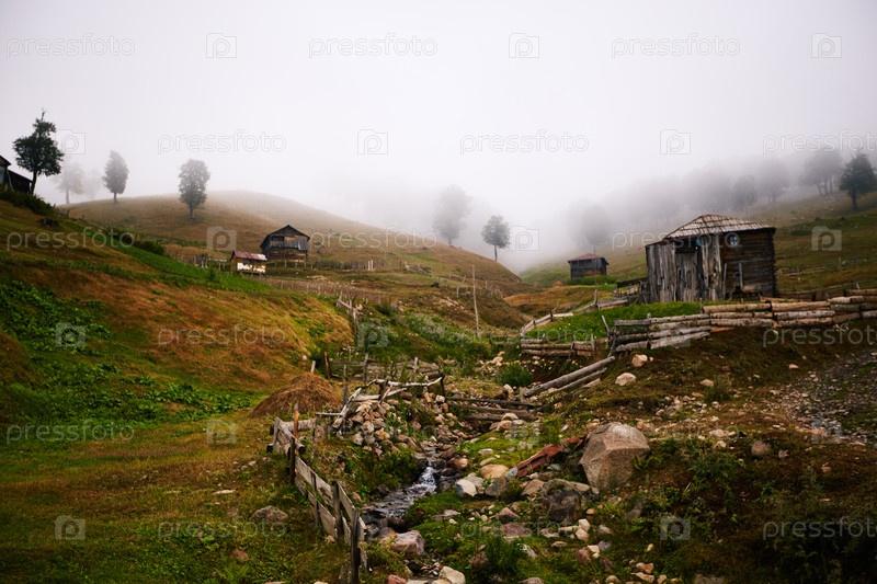 Сельский пейзаж с деревянными домиками и Rolling Hills на туманном утром