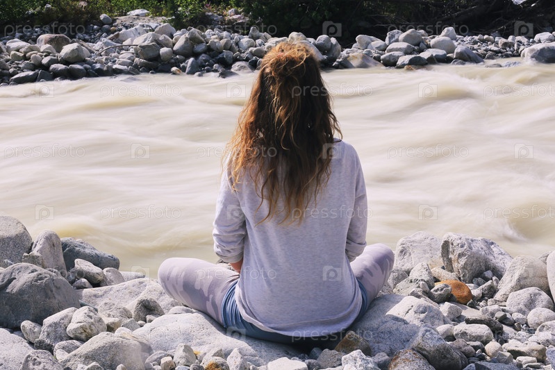 Молодая взрослая женщина сидит с перекрещенными ногами, медитирует у реки