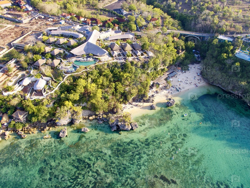 Вид с воздуха на Тропический курорт с видом на пляж и кристально чистую лагуну