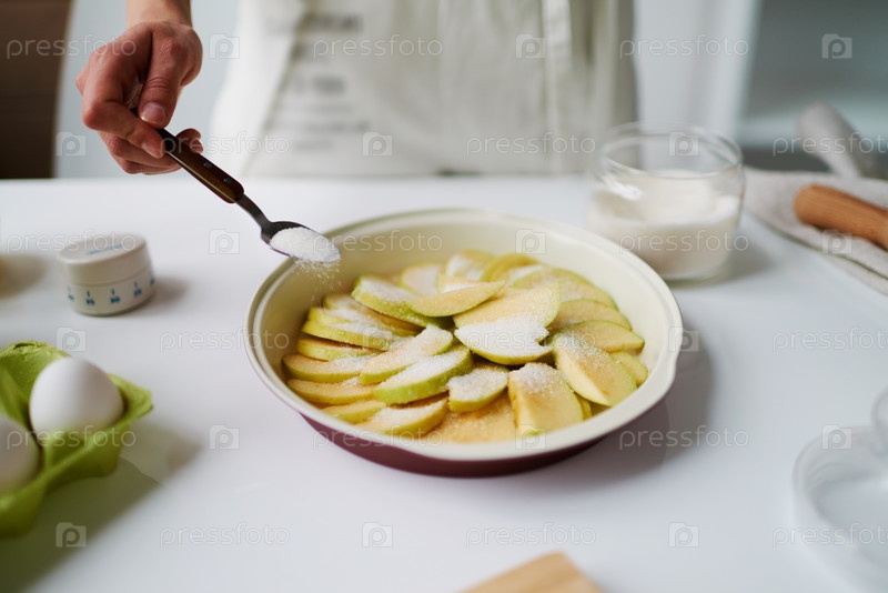 Неизвестная женщина поливает сахаром нарезанные яблоки во время выпечки