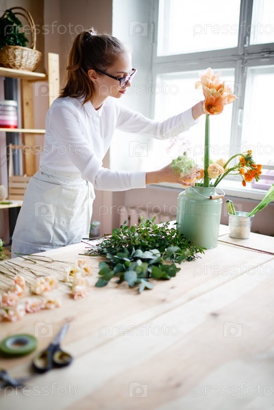 Молодая женщина устраивает свежие цветы в рабочем пространстве Bright Studio