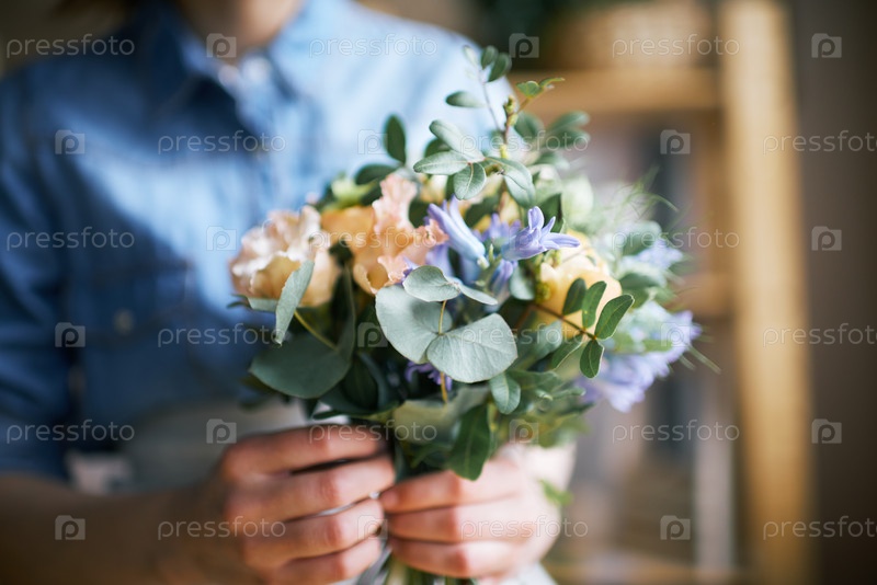 Неизвестная женщина устраивает букет свежих цветов в помещении с осторожными руками