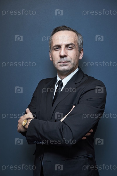 Портрет мужчины среднего возраста, стоящего с складываемыми руками уверенно