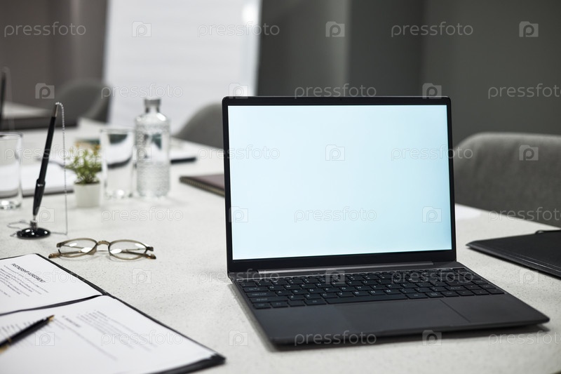 Ноутбук, отображающий пустой экран на офисном столе во время деловой встречи