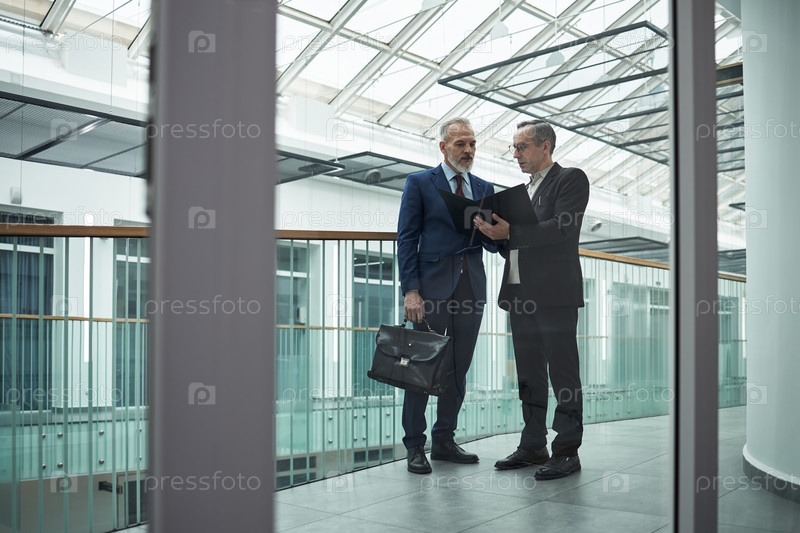 Два бизнесмена средних лет обсуждают документы в офисном зале