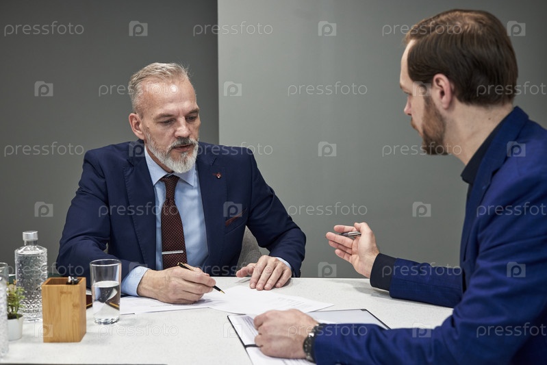 Мужчины среднего возраста обсуждают бизнес-контракт во время офисной встречи