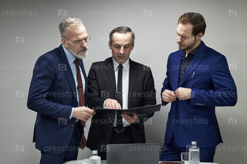 Три мужчины среднего возраста анализируют финансовый отчет во время офисной встречи
