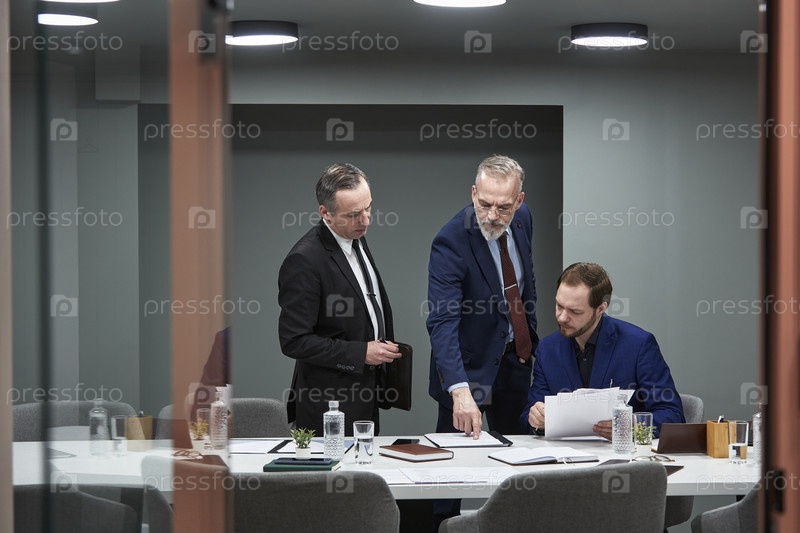 Зрелые бизнесмены, изучающие финансовые данные во время офисной встречи