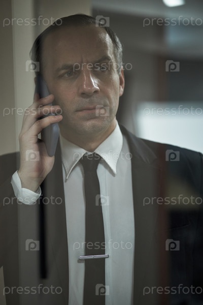 Мужчина средних лет разговаривает со смартфоном в офисной среде