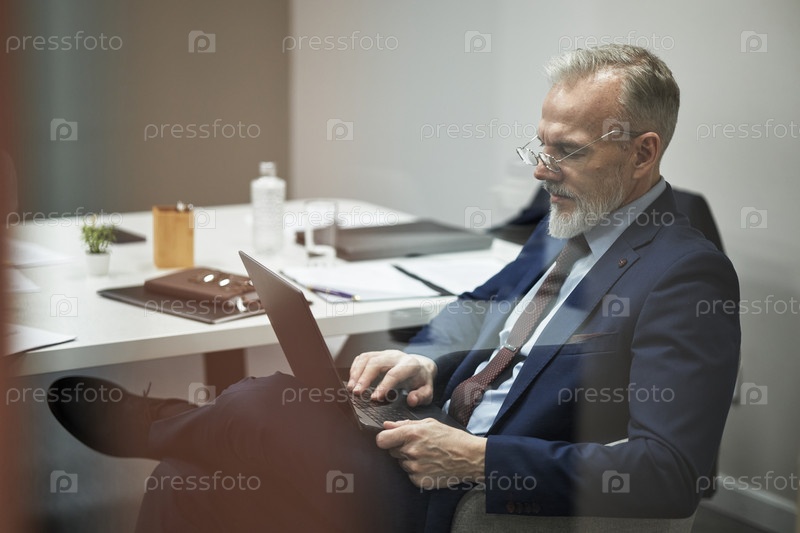 Мужчина средних лет работает на ноутбуке в современной офисной среде