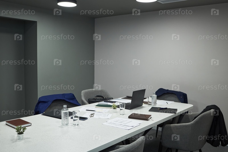 Стол в конференц-зале с деловыми документами и ноутбуком во время совещания