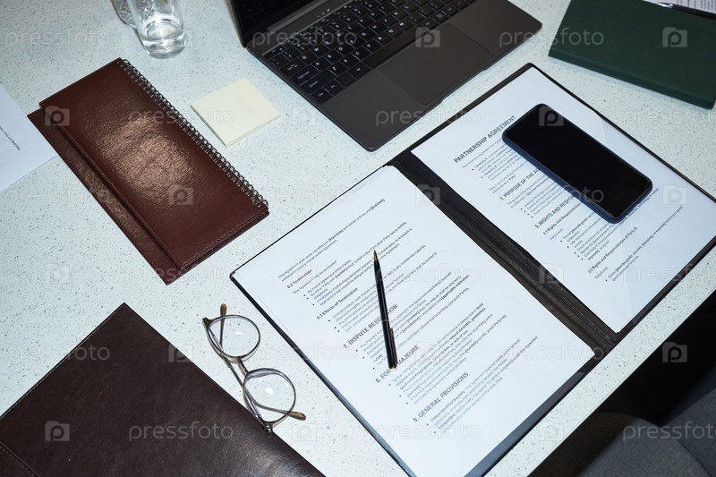 Деловые документы и ноутбук расположены на рабочем столе во время совещания