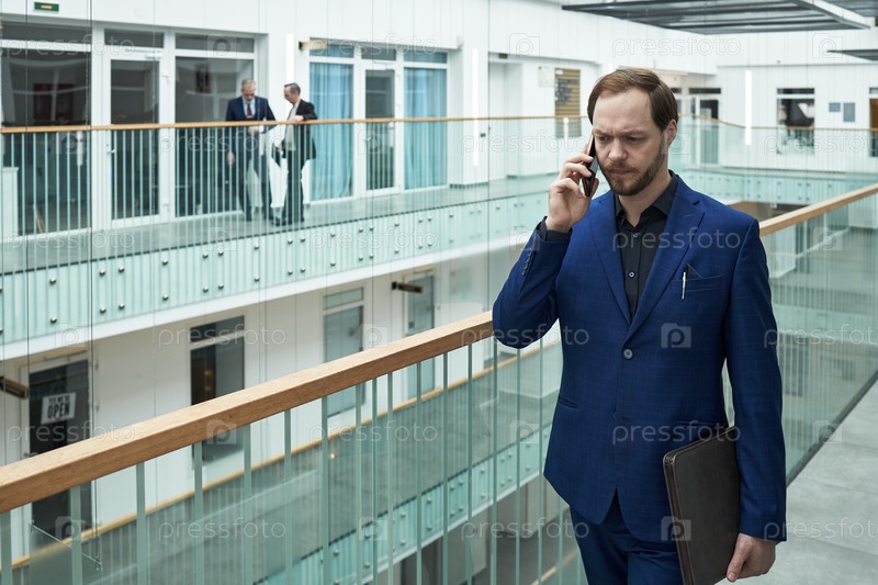 Молодой бизнесмен ходит и разговаривает со смартфоном в коридоре офиса