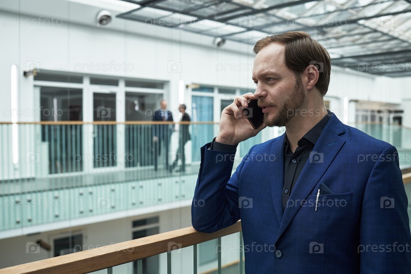 Молодой человек в костюме разговаривает со смартфоном в современном офисном здании