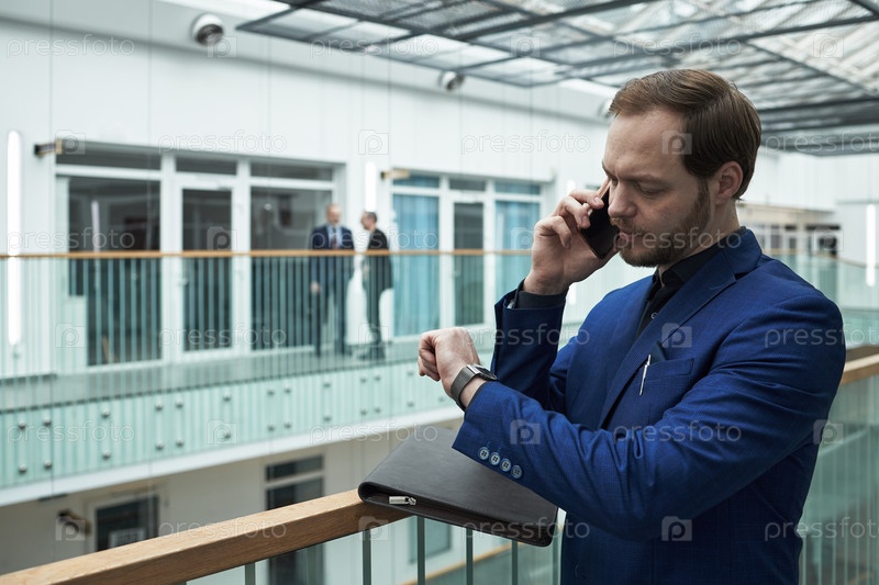 Молодой бизнесмен разговаривает со смартфоном, проверяя наручные часы