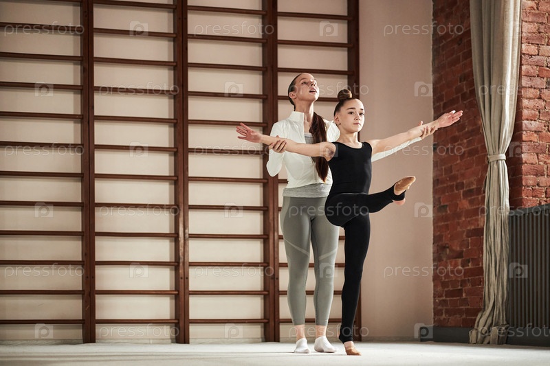 Женщина, обучающая девочку практиковать балетный танец в студии