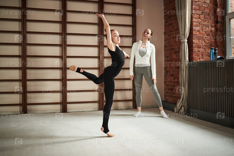 Девушка практикует балетный танец, в то время как молодая женщина наблюдает