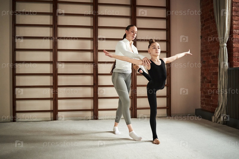 Женщина, обучающая девочку практиковать балетную позу