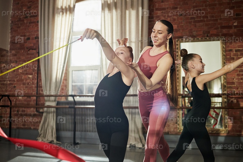 Женщина, обучающая двух девочек ритмической гимнастике
