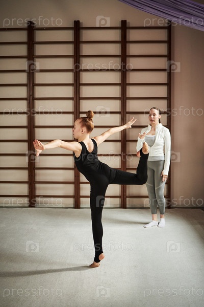 Девушка-подросток практикует балетную позу, в то время как учительница наблюдает