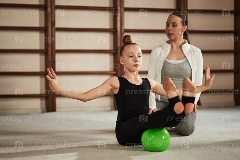 Девушка практикует гимнастику, упражнение на баланс с наблюдающим женским тренером
