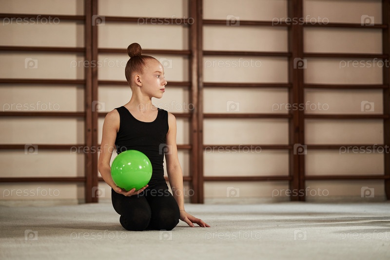 Девушка-подросток практикует ритмическую гимнастику, держа зеленый мяч