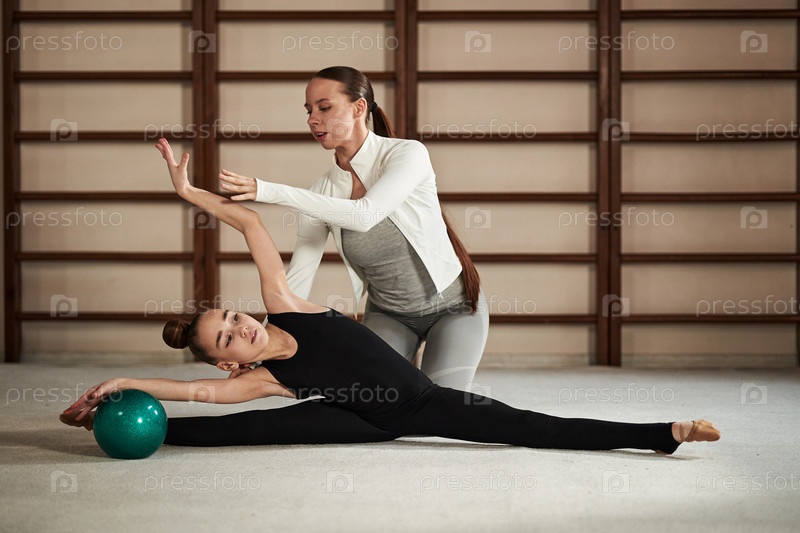 Женщина-тренер направляет молодую девушку, которая занимается гимнастикой и растягиванием