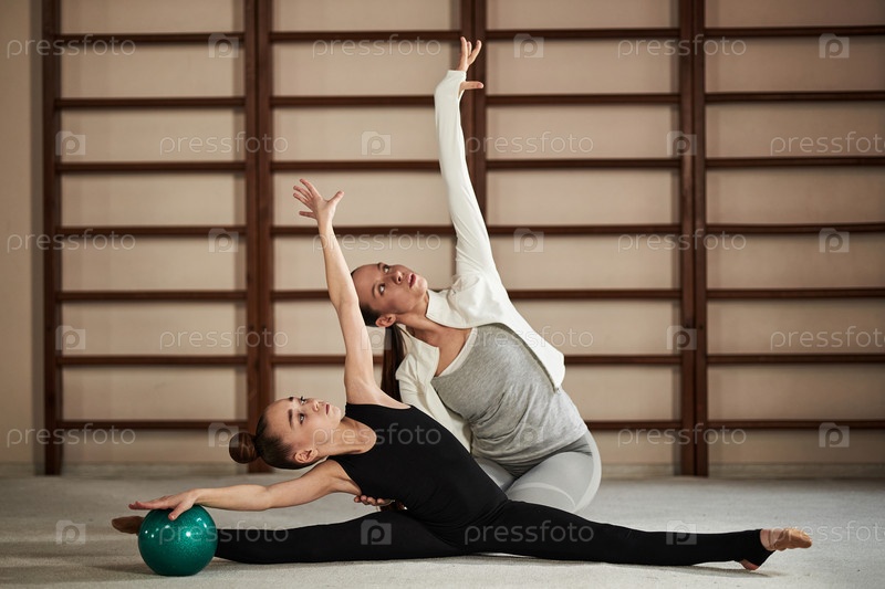 Женщина, обучающая молодую девушку практиковать позу ритмической гимнастики