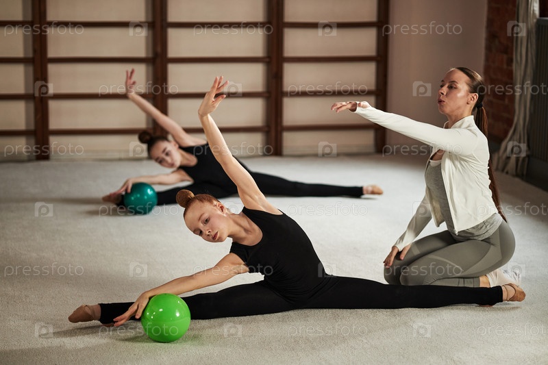Девочки-подростки практикуют ритмическую гимнастику под руководством женского тренера