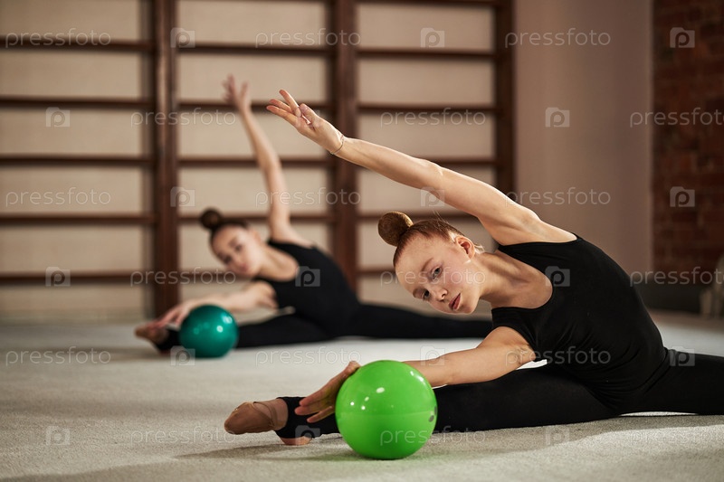 Подростки практикуют ритмическую гимнастику, растягивая мячи