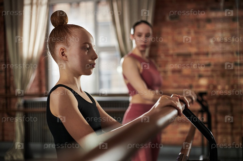 Практикующий балет в Барре с молодой девушкой-тренером, наблюдающей за девочкой