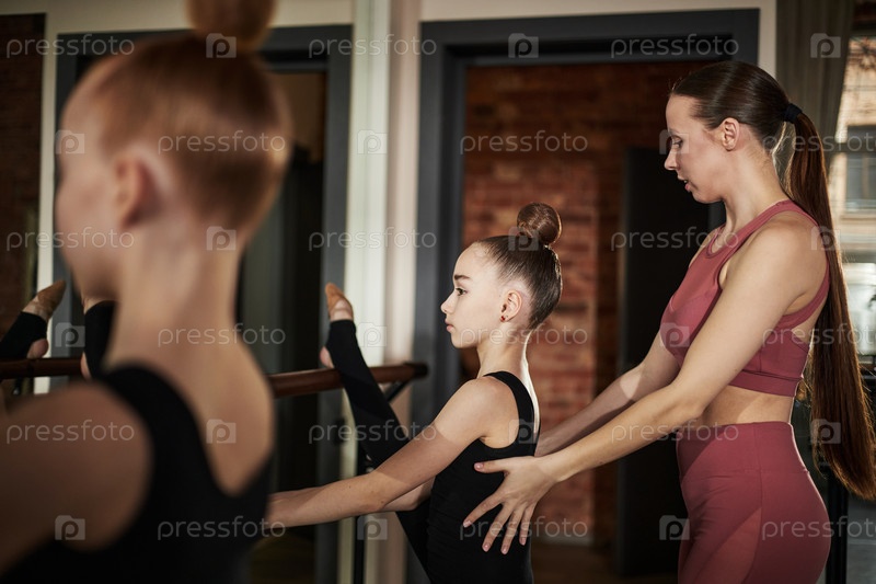 Тренер, обучающий девочку-подростка практиковать балет в Барре