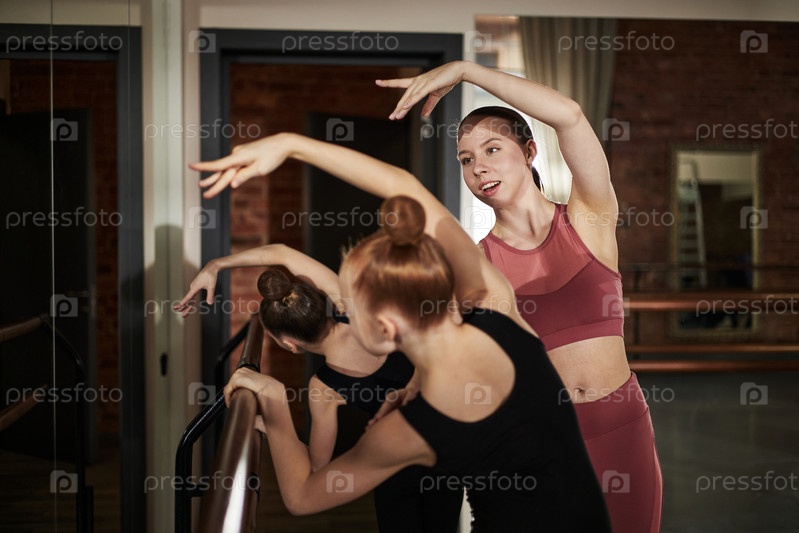 Женщина обучает двух молодых девушек танцевать балет