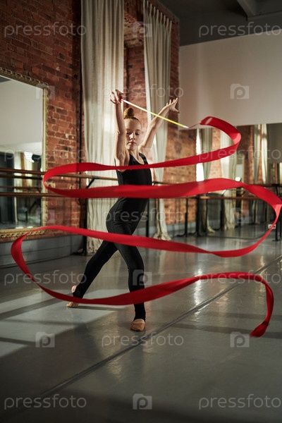 Девушка в леотарде, выполняющая ритмическую гимнастику с ленточкой внутри