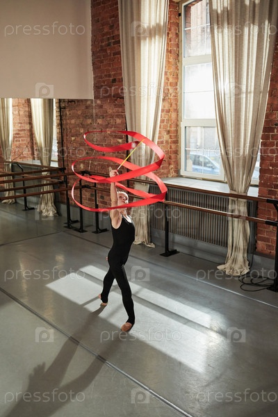 Молодая девушка выполняет ритмическую гимнастику в танцевальной студии