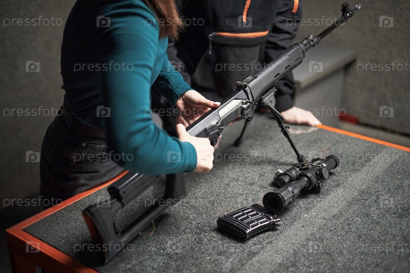 Молодая взрослая женщина собирает винтовку на столе стрельбы в помещении